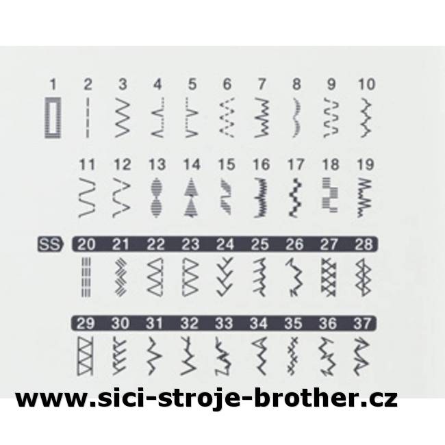 - 37 různých stehů (základní, overlockové, ozdobné vyšívací, pružné)